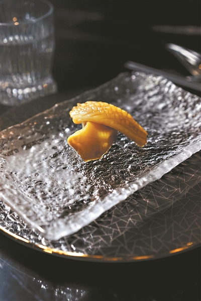 湯焯乃雞油焯響螺。1斤1只的響螺去殼與頭后,凈肉僅僅2兩。切成片狀的響螺經過定時低溫慢煮后,淋上剛剛滾起的熱雞油,上碟時,它旁邊跟著一灘其貌不揚的醬汁,那便是紫蘇醬。響螺配紫蘇,勾起人們對中秋的紫蘇炒田螺的味覺記憶。油焯的風味靈感源自蒜香骨這道傳統(tǒng)粵菜,取蒜香味結合魚露醬,融入花膠天婦羅之中。將花膠以天婦羅的方式展現(xiàn),這也是大膽的嘗試。味焯的做法則讓人更熟悉,立馬想起前些年風靡廣州的鹵水火鍋來。獅頭鵝的鵝肝在鹵水里泡著溫泉,時間一到才起身,并不太咸,香濃恰好。還有汽焯,是用最當造的大黃花魚,將整個迷你小蒸籠搬到面前來,現(xiàn)蒸現(xiàn)吃,7分鐘,嫩度正好?;痨虅t是燒烤澳大利亞和牛肉的燒烤方式,這最原始的烹飪方式里夾著迷迭香和百里香的誘人香氣。而這每一道菜肴,僅僅數口的分量,道道位上,分量恰到好處,避免了餐桌上的浪費。