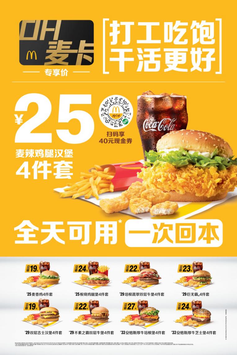 調(diào)研還顯示,超過四成的消費(fèi)者表示希望在餐飲上節(jié)約至少10%的支出,而麥當(dāng)勞的“打工人保底計(jì)劃”提供了多種大力度的優(yōu)惠。以午餐為例,消費(fèi)者若購買OH麥卡,享用超值四件套即可至少節(jié)省19元,即減少39%的開支。