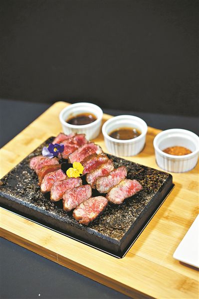 4.準備一塊燒熱的石板,將牛肉厚片放于其上,配上黑椒汁、黑松露汁和牛排調(diào)料即可(圖⑥)。