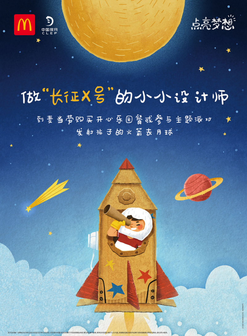 2021點(diǎn)亮夢想活動(dòng),是麥當(dāng)勞與中國探月的二度合作,雙方再次聯(lián)合守護(hù)夢想,并鼓勵(lì)動(dòng)手實(shí)踐,做到“敢夢敢想敢為”。