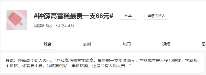 鐘薛高誕生于2018年3月,在當(dāng)年“雙11”就已成為天貓冰品類銷售第一,其被粉絲稱為“雪糕界的愛馬仕”,有人是鐘薛高的忠實(shí)粉絲,也有很多人吐槽其價(jià)格太過于昂貴。