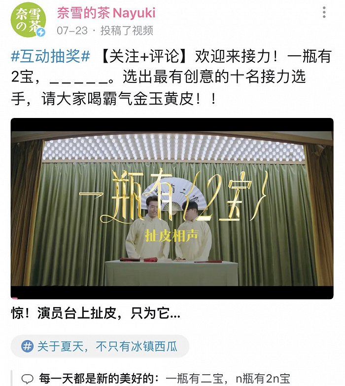 在此之前,奈雪曾用“說相聲”的方式推霸氣金玉黃皮,讓茶飲和相聲組CP;霸氣生椰斑斕上架時,他們出了個東南亞風(fēng)滿滿的視頻,仿佛一秒到了泰國,創(chuàng)意有趣的同時,也讓消費(fèi)者對產(chǎn)品留下深刻印象。