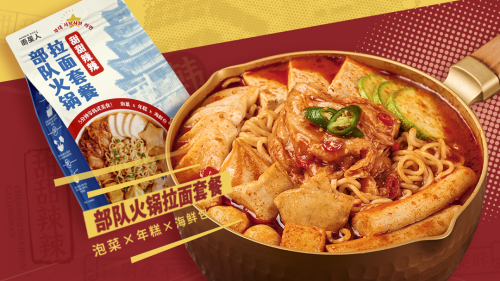 面星人的部隊(duì)火鍋拉面套餐以甜辣濃郁的湯底為基底,搭配了Q彈筋道的拉面、5種食材的海鮮、開胃辣白菜和軟糯年糕,盡可能將餐廳堂食級(jí)口味以速食的方式呈現(xiàn)給中國(guó)的食客們。
