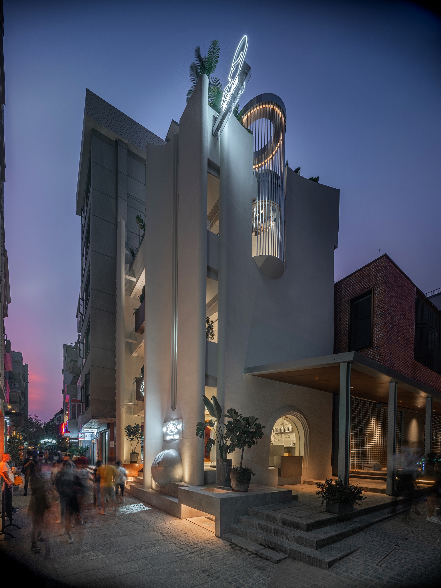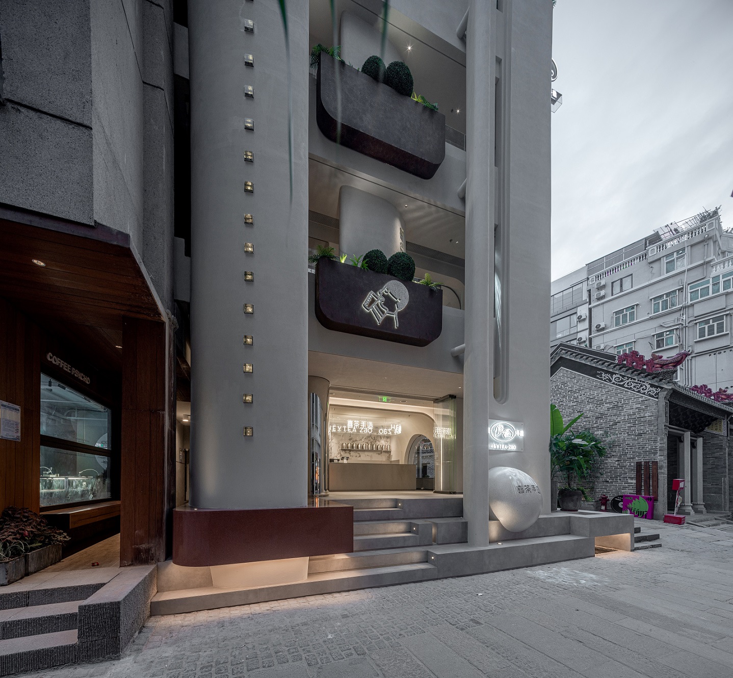 門店整體建筑設(shè)計(jì)是從幾何圖形中抽象出簡潔線條,改變原先外立面單一的線性結(jié)構(gòu),突破對于建筑形態(tài)的固有思維。外立面則選用水紋氣泡玻璃磚、做舊的復(fù)古外墻肌理漆,二、三樓陽臺(tái)花槽由銹鐵材質(zhì)制成,強(qiáng)調(diào)歷史感。同時(shí),整體建筑中有一道空凹槽,自上而下營造水流不息的視覺感、靈動(dòng)感,形成動(dòng)靜結(jié)合的整體樓面。