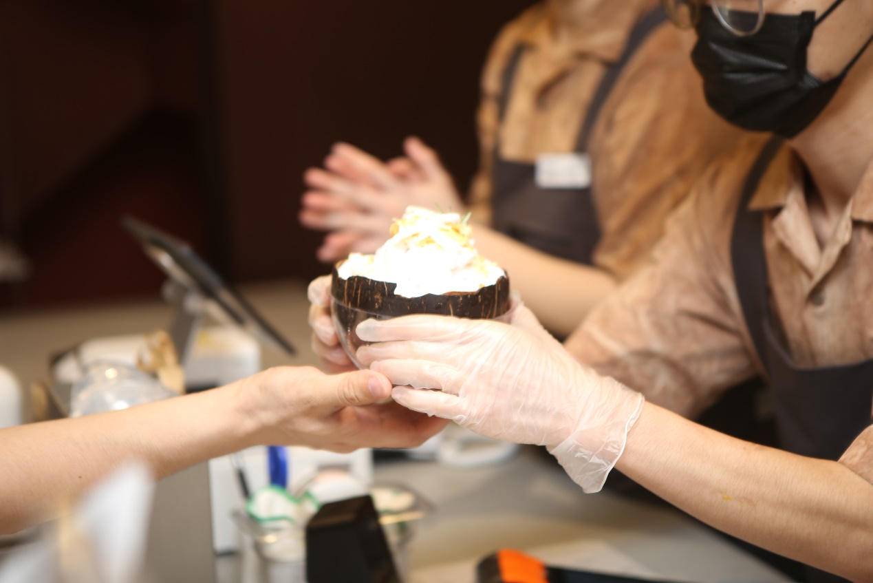一次性提供如此豐富的手造新品,既是喜茶產(chǎn)品研發(fā)能力的集中體現(xiàn),又是為顧客奉上的極致體驗(yàn)。記者在現(xiàn)場(chǎng)看到,10點(diǎn)正式營(yíng)業(yè)后,在一樓點(diǎn)單區(qū),店員們開始耐心地向顧客進(jìn)行新品介紹和推薦。一些顧客則留意到正在進(jìn)行的現(xiàn)場(chǎng)炒冰,“剛剛做的那份是什么?我就要那個(gè)!”而二層供應(yīng)的“實(shí)在整顆生椰”,也讓不少顧客愛不釋手。