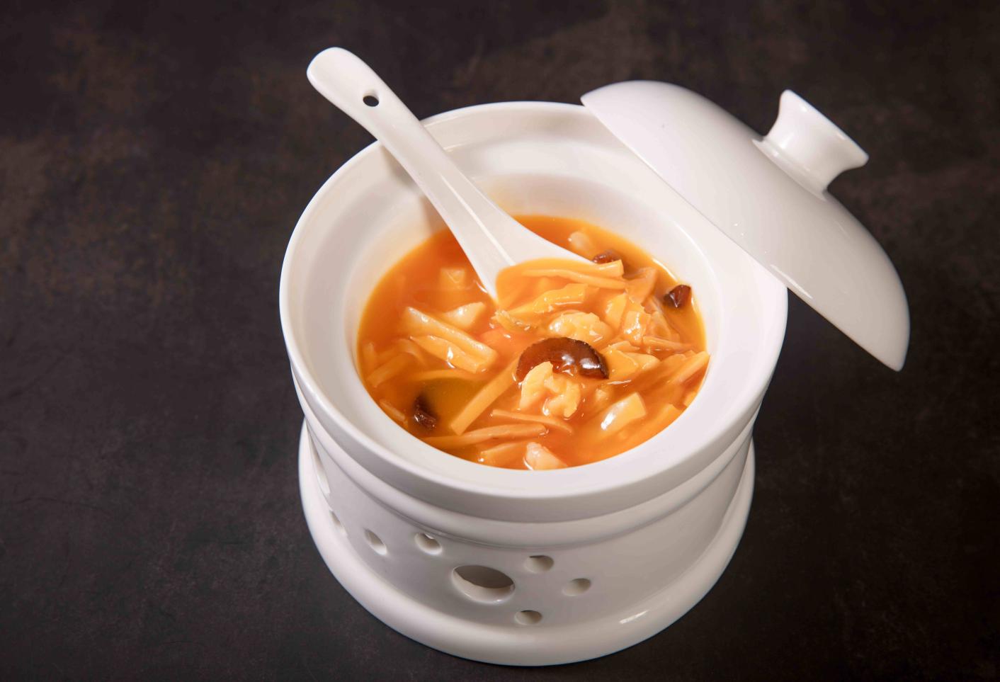 蟹粉?;矢赫邕x多種海洋珍饈,肉厚品佳的海參,軟嫩滑爽的鮮鮑,白如玉簪的白靈菇,在蟹粉濃湯的渲染下,一湯匙入口,滿滿都是精華;