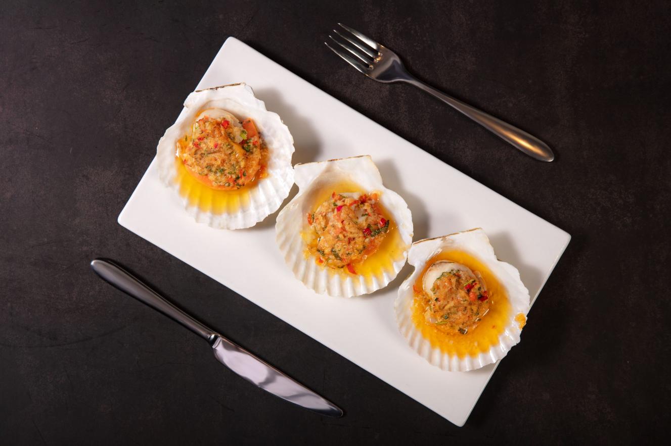 蟹粉烤元貝:雪白無瑕,口舌生香的元貝,伴隨著蟹粉的噴香,鮮上加鮮;