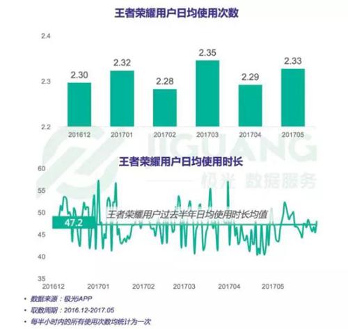 根據(jù)極光大數(shù)據(jù)的統(tǒng)計,《王者榮耀》用戶白天游戲高峰時段為12:00-13:00,占比為6.97%;晚間游戲高峰為21:00-23:00,共占比13.63%在過去的半年里《王者榮耀》日均使用次數(shù)在2.3次左右,日均使用時長基本在40~55分鐘這一區(qū)間。從此處來看,其用戶使用情況并沒有達到一個與常規(guī)游戲差異巨大的程度。