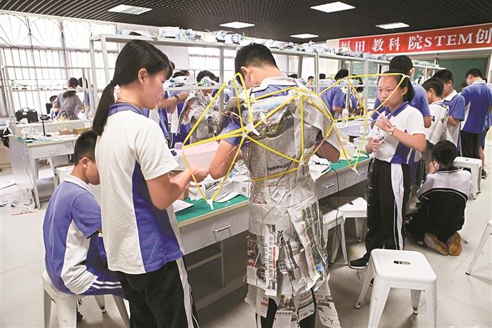 當(dāng)日,學(xué)生與機(jī)器人同臺主持開幕式,在科技中學(xué)首次實(shí)現(xiàn)了現(xiàn)場語音識別,讓大家近距離感受了一把AI在現(xiàn)實(shí)生活中的應(yīng)用?!案?票鼻嗌倌陝?chuàng)客大挑戰(zhàn)有來自福田區(qū)各校60多支隊(duì)伍參與,比賽要求參賽隊(duì)伍在使用吸管、透明膠、報(bào)紙、剪刀、可控?zé)魩?、穿孔燈等簡單的材料和工具,且?shù)量使用有限制的情況下,設(shè)計(jì)一件“未來”校服,制作限定時(shí)間1小時(shí)30分鐘。