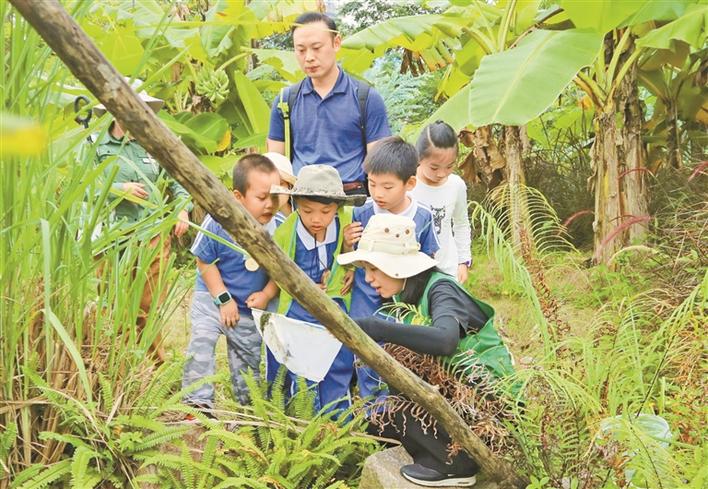 學(xué)生在志愿老師的帶領(lǐng)下探秘濕地,親近自然。