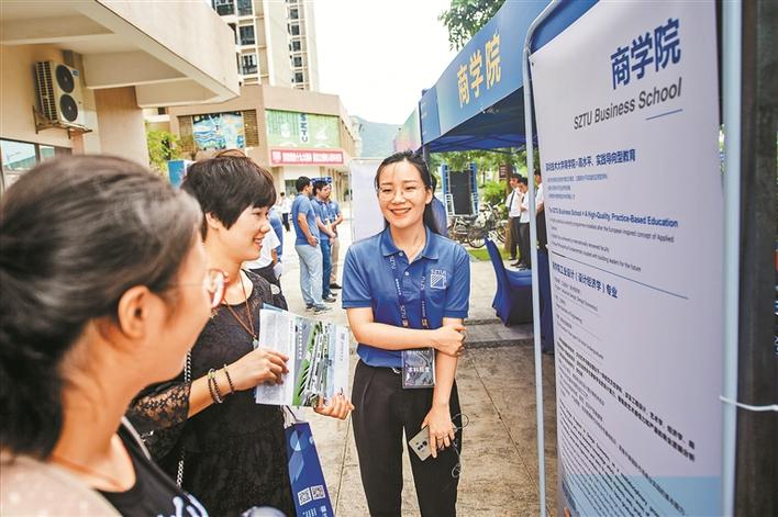在商學(xué)院的招生咨詢展位前,來自德國的教授戈?duì)栠_(dá)娜·基蘭笑意盈盈地向?qū)W生和家長遞上學(xué)院宣傳冊。戈?duì)栠_(dá)娜·基蘭說,她被深圳這座城市的氣質(zhì)和深技大的辦學(xué)模式吸引,今年3月加入學(xué)校成為一名全職教授?!霸诘聡瑧?yīng)用技術(shù)大學(xué)都設(shè)有商學(xué)院,很高興今年技術(shù)大學(xué)開設(shè)商學(xué)院,培養(yǎng)更多優(yōu)秀的創(chuàng)新創(chuàng)業(yè)人才。”
