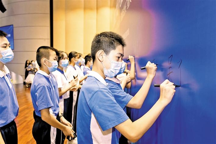 “自覺遵守互聯(lián)網(wǎng)相關政策和法律法規(guī),積極培育和踐行社會主義核心價值觀……”海韻學校的學生們現(xiàn)場朗讀《寶安青少年“文明上網(wǎng)·健康成長”倡議書》,并在承諾墻上莊嚴地簽下自己的名字。