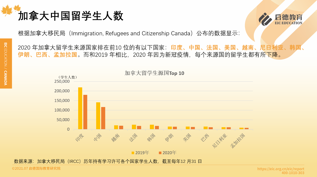另一組數(shù)據(jù)顯示,2020年中國(guó)內(nèi)地學(xué)生新增人數(shù)最多的三個(gè)省為安大略?。?9.78% )、英屬哥倫比亞?。?6.17% )、魁北克?。?.49% )。一方面,安大略省與英屬哥倫比亞省這兩個(gè)省份的教育資源非常豐富,有多所世界知名大學(xué)讓中國(guó)學(xué)生選擇;另一方面,多倫多、溫哥華、渥太華等大城市均在這兩個(gè)省份,工作機(jī)會(huì)多,移民政策也相對(duì)成熟,對(duì)希望留在加拿大發(fā)展的留學(xué)生很具吸引力。