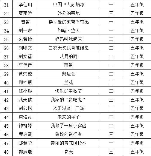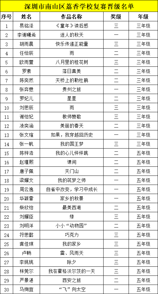 自2021年1月,活動征稿啟動以來,獲得了深圳市廣大中小學生、教師、文學愛好者的熱烈響應積極參與,吸引了深圳百余所學校的上萬人關注報名。現公布南山區(qū)荔香學校晉級復賽名單如下:
