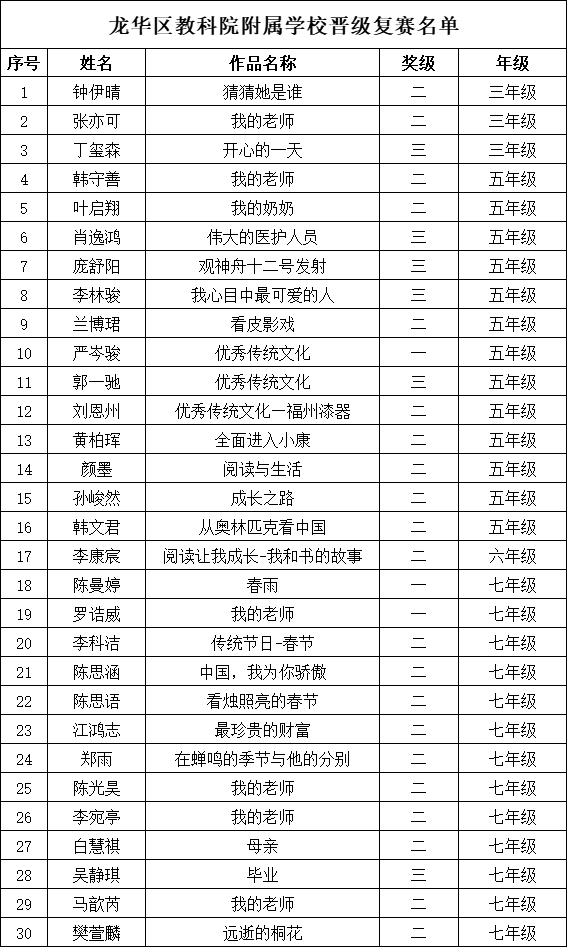 自2021年1月,活動征稿啟動以來,獲得了深圳市廣大中小學生、教師、文學愛好者的熱烈響應積極參與,吸引了深圳百余所學校的上萬人關(guān)注報名。現(xiàn)公布深圳市龍華區(qū)教科院附屬學校晉級復賽名單如下: