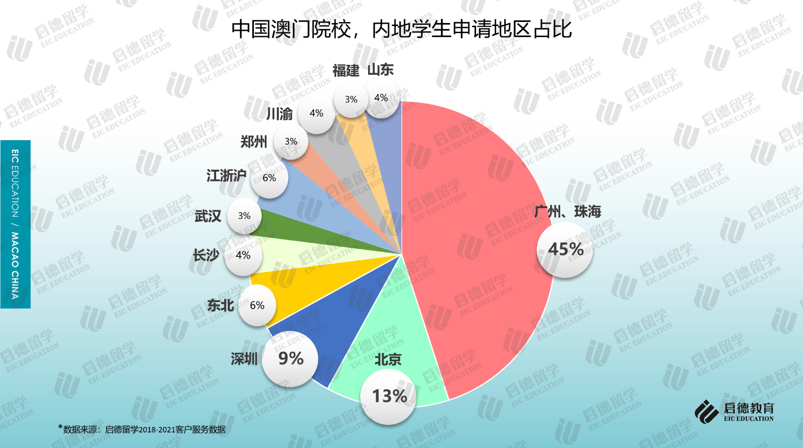 另一組啟德留學(xué)的澳門院校申請人來源數(shù)據(jù)顯示,廣東省廣州、珠海、深圳三個城市的學(xué)生申請澳門院校的占比超過50%,北京學(xué)生占比13%,分析原因,除了廣東省與澳門在文化上、生活方式上的親近性以及距離較近的優(yōu)勢外,也與澳門院校對部分區(qū)域申請人的加分政策有一定關(guān)系。如澳門大學(xué)對北京市及廣東省高考考籍的學(xué)生有加5分的優(yōu)惠政策,而對于廣東省珠海市考籍和橫琴戶籍的應(yīng)屆高考生又特別優(yōu)待,實施15-20分的加分優(yōu)惠政策。