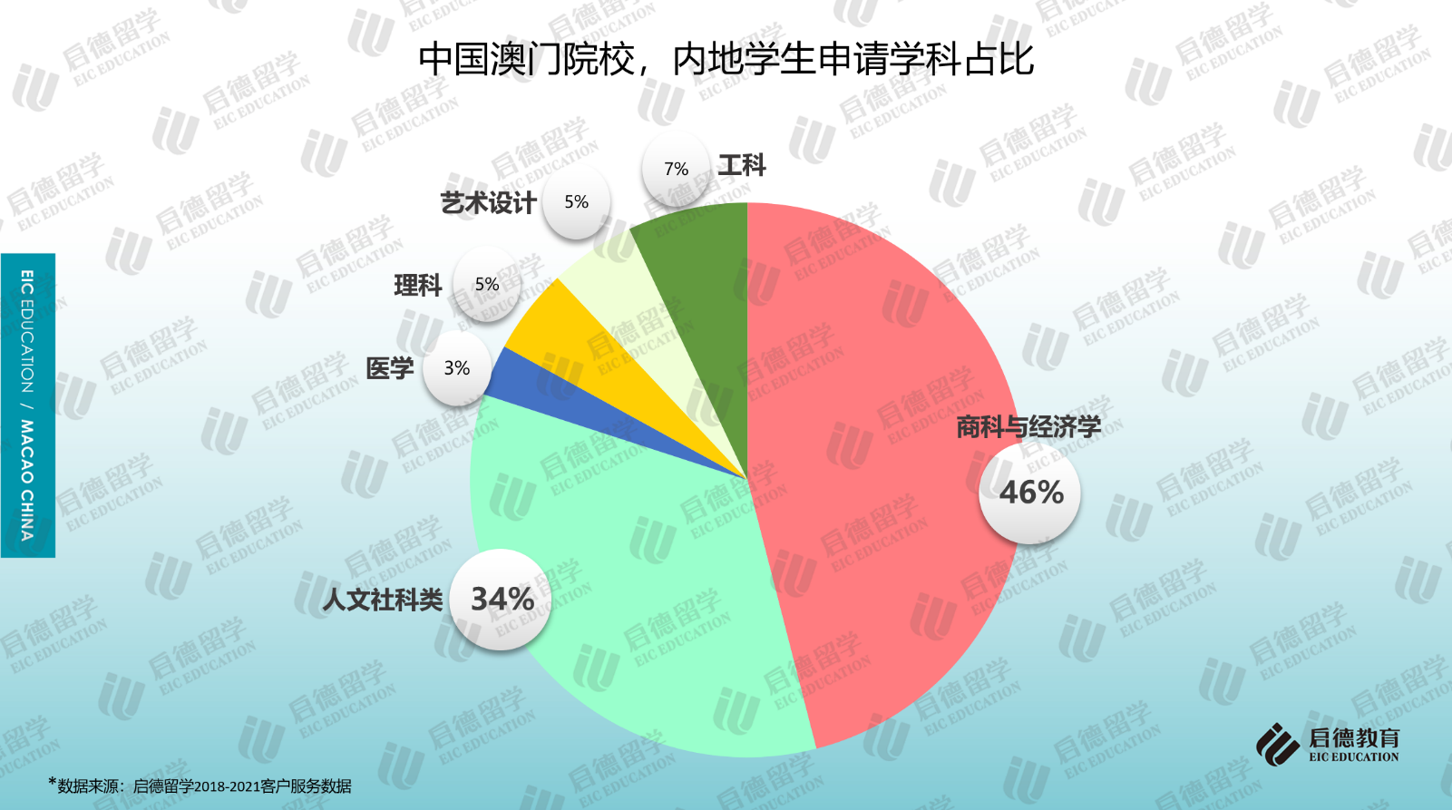 啟德留學(xué)2018-2021客戶服務(wù)數(shù)據(jù)顯示,商科與經(jīng)濟(jì)學(xué)(46%)、人文社科類(34%)、理工科(12%)在澳門高校的申請占比位居前三。在商科與經(jīng)濟(jì)學(xué)的細(xì)分專業(yè)中,工商管理、旅游與酒店管理、會計的申請占比超過6成;在人文社科類的細(xì)分專業(yè)中,傳媒、法學(xué)、語言學(xué)的申請占比超過6成;電子與計算機(jī)(55%)成為理工科選擇最多的專業(yè)。作為澳門求學(xué)的主要學(xué)科,澳門院校的商科碩士專業(yè)對GMAT/GRE考試不作硬性要求。