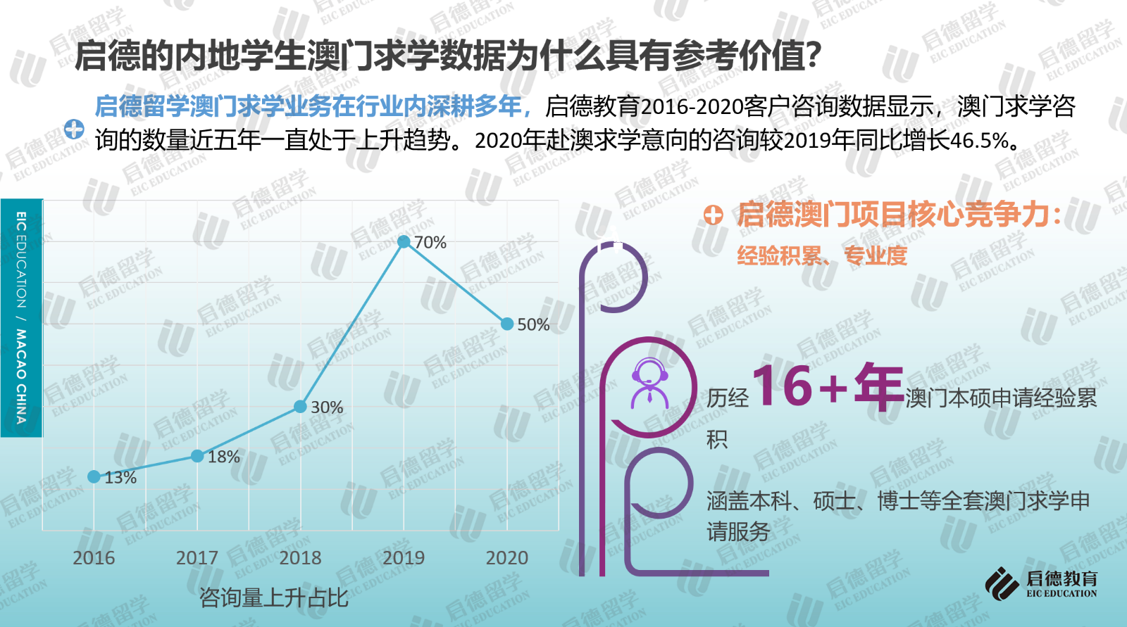 啟德留學(xué)2016-2020客戶服務(wù)數(shù)據(jù)顯示,澳門求學(xué)咨詢量近五年一直處于上升趨勢,2020年咨詢量較2019年同比增長46.5%。2021年10月31日,啟德留學(xué)在北京發(fā)布《2021中國澳門求學(xué)報告》,這也是行業(yè)內(nèi)首次針對中國內(nèi)地學(xué)生赴澳門求學(xué)情況進(jìn)行的梳理與分析,《報告》結(jié)合澳門高校官方數(shù)據(jù)及最近四年啟德學(xué)生澳門求學(xué)申請與錄取數(shù)據(jù),重點(diǎn)分析了澳門求學(xué)的申請要求與錄取趨勢、澳門六大高校的特色與優(yōu)勢專業(yè)、澳門本地就業(yè)情況,并就赴澳門求學(xué)規(guī)劃、申請準(zhǔn)備及求職就業(yè)等方面提供了建議。