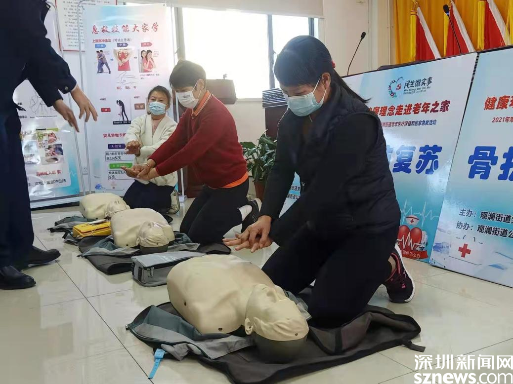 據(jù)了解,觀瀾街道有多家老年人之家、長(zhǎng)者服務(wù)中心,為積極應(yīng)對(duì)人口老齡化,滿足轄區(qū)老年人對(duì)居家急救、居家健康知識(shí)的迫切需求,街道積極開展老年醫(yī)療保健和居家急救活動(dòng),如心肺復(fù)蘇急救體驗(yàn)學(xué)習(xí)、骨折包扎體驗(yàn)學(xué)習(xí)、防異物梗塞體驗(yàn)學(xué)習(xí)等,使老年人充分了解到生活中一些突發(fā)事件的應(yīng)對(duì)方法,在保護(hù)自己的同時(shí)也能夠幫助到他人,為實(shí)現(xiàn)居民應(yīng)對(duì)“突發(fā)疾病”的自救奠定良好基礎(chǔ)。