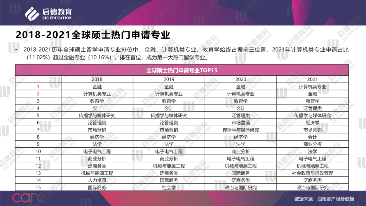 啟德留學(xué)客戶服務(wù)數(shù)據(jù)顯示,2018-2021歷年全球碩士留學(xué)申請專業(yè)排位中,金融、計算機(jī)類專業(yè)、教育學(xué)始終占據(jù)前三位置。2021年,計算機(jī)科學(xué)與信息系統(tǒng)(偏理科)、計算機(jī)科學(xué)與信息系統(tǒng)(偏工科)、電子與計算機(jī)工程、數(shù)據(jù)科學(xué)這四個計算機(jī)類專業(yè)的碩士申請占比合計為11.02%,超過金融專業(yè)(10.16%),成為第一大熱門留學(xué)專業(yè)。2021商科申請占比超過40%,理工科申請占比超過四分之一。其中,商科熱門碩士專業(yè)金融(10.16% )、經(jīng)濟(jì)學(xué)(4.63% )、市場營銷(4.43% )、會計(3.92% )、商業(yè)分析(2.99% )的申請占比為26.13%,理工科熱門碩士專業(yè)計算機(jī)(11.02% )、電子電氣工程(2.66% )、機(jī)械與能源工程(2.15% )的申請占比為15.83%。
