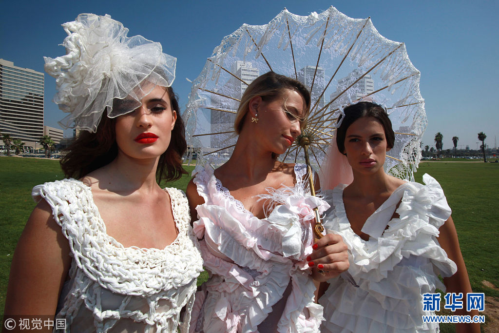 ????特拉維夫,模特身上穿著手紙制作的婚紗。9月9日是個(gè)大吉之日,大批新人將會(huì)在當(dāng)日扎堆結(jié)婚。(圖片來源:視覺中國)