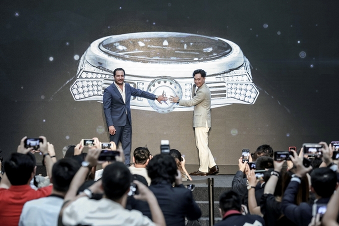 ????真力時全球首席執(zhí)行官朱利安?托內(nèi)爾先生與陳奕迅共同按動了大屏幕上的虛擬時計表冠