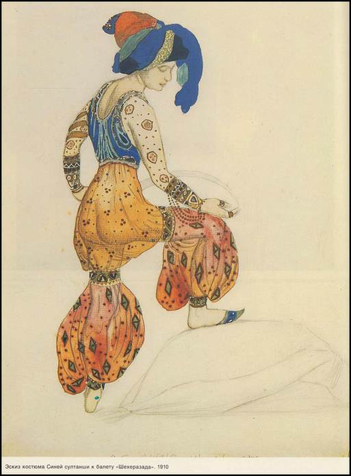 利昂?巴克斯特為芭蕾舞劇《天方夜譚》(Scheherazade)設計的舞臺服裝,1910年