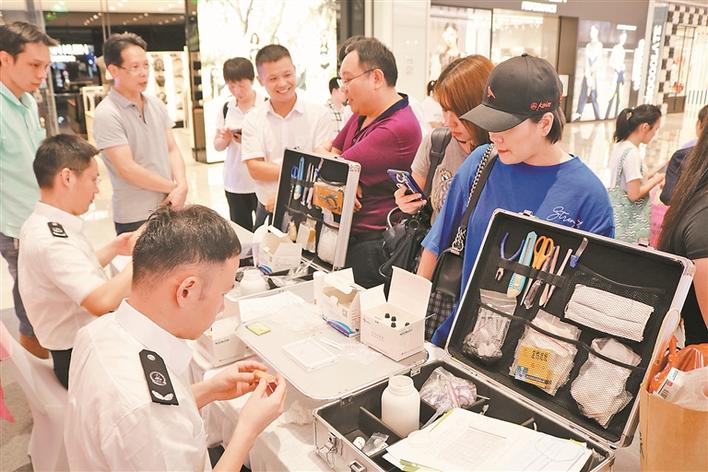 “我想檢測一下我的化妝品是否安全”,市民蔣女士帶著自己日常用的面膜在壹方城化妝品快檢點排起了隊,“往臉上涂的一定要格外注意,有沒有非法添加違禁物質(zhì)要檢測后才知道,看到今天有免費檢測,我就立馬過來了”。原來,為強(qiáng)化轄區(qū)化妝品的監(jiān)管力度,深化消費者對化妝品安全的認(rèn)識,深圳市市場和質(zhì)量監(jiān)督管理委員會寶安局醫(yī)療器械科9月13日在壹方城內(nèi)舉行了以“守護(hù)美麗,安全同行”為主題的化妝品安全宣傳活動,現(xiàn)場的“你送我檢”活動備受愛美人士歡迎。市市場和質(zhì)量監(jiān)管委?;幐碧庨L方友川、市市場和質(zhì)量監(jiān)管委寶安局副局長陳子晟參與當(dāng)天活動。