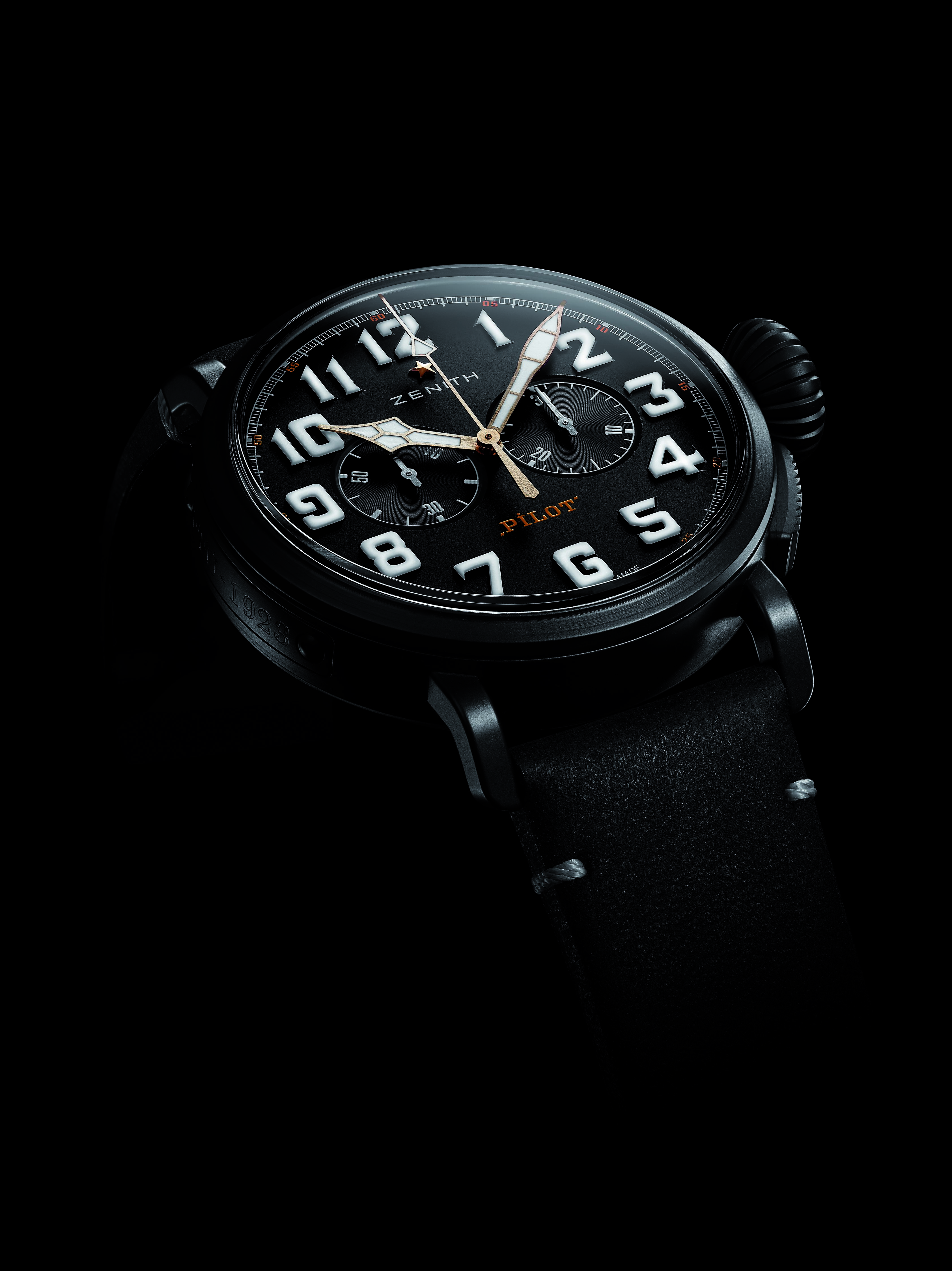 新款黑色的表盤非常簡(jiǎn)潔,不配備日期或日歷信息。大尺寸的分針和秒針(飛行員腕表的典型特征)以及阿拉伯?dāng)?shù)字時(shí)標(biāo)皆覆有SuperLumiNova?白色夜光涂層,外加雙計(jì)時(shí)碼表的輔助——9點(diǎn)位置的小秒針盤和3點(diǎn)位置的計(jì)時(shí)碼表分鐘計(jì)時(shí)器提供清晰的讀時(shí)。整塊腕表由真力時(shí)自制的傳奇EL PRIMERO4069型自動(dòng)機(jī)芯提供動(dòng)力,以5赫茲(每小時(shí)振動(dòng)36,000次)運(yùn)行,動(dòng)力儲(chǔ)備達(dá)50個(gè)小時(shí)。精準(zhǔn)的計(jì)時(shí)讓您穩(wěn)穩(wěn)地抓住每分每秒。