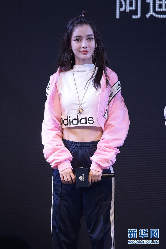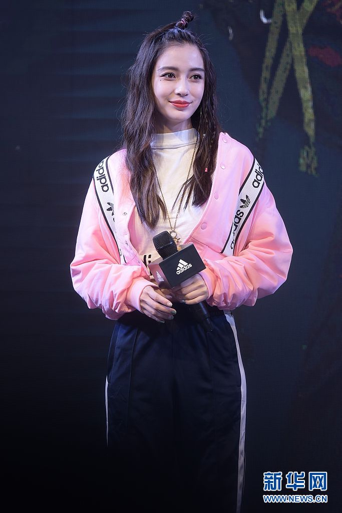 Angelababy粉色夾克+運動褲 梳蘋果頭嬌俏