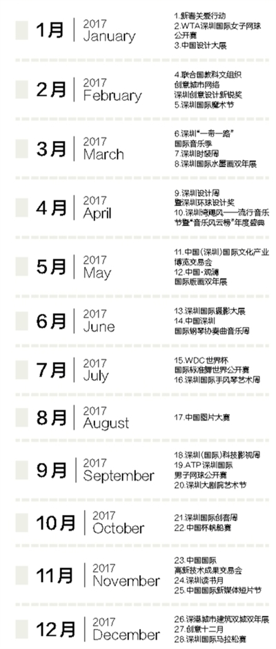 往細(xì)里說,“城市文化菜單”呈現(xiàn)出鮮明亮點(diǎn):一是國(guó)際化程度高。大部分活動(dòng)都有國(guó)際權(quán)威和國(guó)家級(jí)專業(yè)機(jī)構(gòu)主辦或授權(quán)支持,不少活動(dòng)代表了我國(guó)這一領(lǐng)域的最高水準(zhǔn),是可以代表深圳國(guó)際化城市形象的“文化大餐”。二是內(nèi)容豐富多彩。這份“菜單”表面上看只有28項(xiàng),實(shí)際上每項(xiàng)活動(dòng)時(shí)間跨度從幾天到一個(gè)多月不等,由十?dāng)?shù)項(xiàng)甚至上百項(xiàng)活動(dòng)組成,各款“菜式”都有,不同口味的人都可以自行“看單點(diǎn)菜”。三是體現(xiàn)深圳特色。“菜單”中有三分之一的活動(dòng)與創(chuàng)新創(chuàng)意有關(guān),正好體現(xiàn)了深圳“創(chuàng)新之城”、“設(shè)計(jì)之都”的城市特性,可謂是深圳的文化“特產(chǎn)”。四是新的品牌活動(dòng)首次集體亮相。經(jīng)過多年培育,深圳已經(jīng)擁有文博會(huì)、高交會(huì)、讀書月、創(chuàng)意12月等傳統(tǒng)品牌活動(dòng),接下來還要精心打造一系列新的文化品牌活動(dòng)。在這份“菜單”中,2016年及今年新創(chuàng)辦的就有深圳“一帶一路”國(guó)際音樂季、深圳國(guó)際科技影視周、深圳國(guó)際攝影大展、深圳設(shè)計(jì)周、中國(guó)圖片大賽等多項(xiàng)活動(dòng),文博會(huì)、新春關(guān)愛行動(dòng)、國(guó)際魔術(shù)節(jié)等老牌活動(dòng)也都將有新的策劃、新的提升,更具國(guó)際化內(nèi)涵。一句話,這份菜單共匯集了國(guó)際化、標(biāo)志性的品牌文化活動(dòng)28項(xiàng),涵蓋文化藝術(shù)、創(chuàng)意設(shè)計(jì)、科技創(chuàng)新、體育休閑等多個(gè)類別,是廣義的文化活動(dòng)的概念。