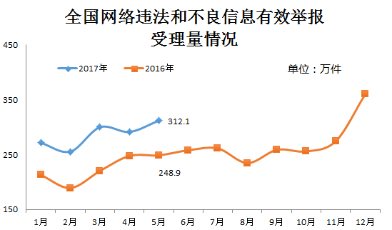 5月份,各地網(wǎng)信辦各網(wǎng)站深入貫徹落實(shí)2017年全國(guó)網(wǎng)絡(luò)舉報(bào)工作會(huì)議暨第三批百家網(wǎng)站公布舉報(bào)受理方式會(huì)議精神,同時(shí)在“六一”國(guó)際兒童節(jié)到來前,進(jìn)一步加大對(duì)網(wǎng)上違法和不良信息,特別是淫穢色情等嚴(yán)重危害青少年身心健康有害信息的處置力度,受理違法和不良信息有效舉報(bào)312.1萬件,環(huán)比、同比分別增長(zhǎng)約7.1%和25.4%。
