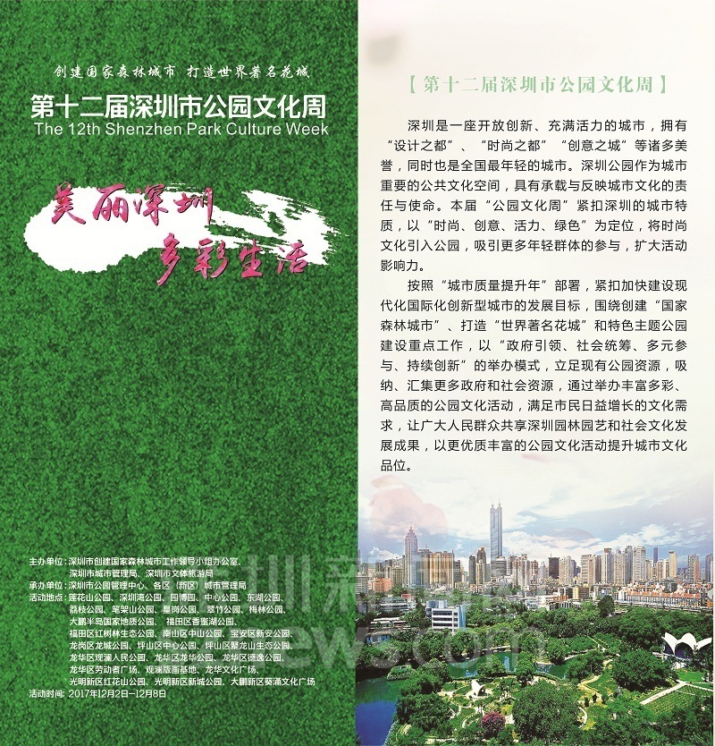 深圳新聞網(wǎng)12月1日訊(記者 鐘鴻冰 通訊員 崔嵩)一年一度的公園文化節(jié)即將到來,12月2日-12月8日,2017年第十二屆公園文化周將在全市27家公園舉行。本屆公園文化周緊密結(jié)合創(chuàng)建“國家森林城市”和打造“世界著名花城”重點工作,以“美麗深圳 多彩生活”為主題,充分展現(xiàn)美麗宜居的城市環(huán)境及豐富多彩的城市文化生活。