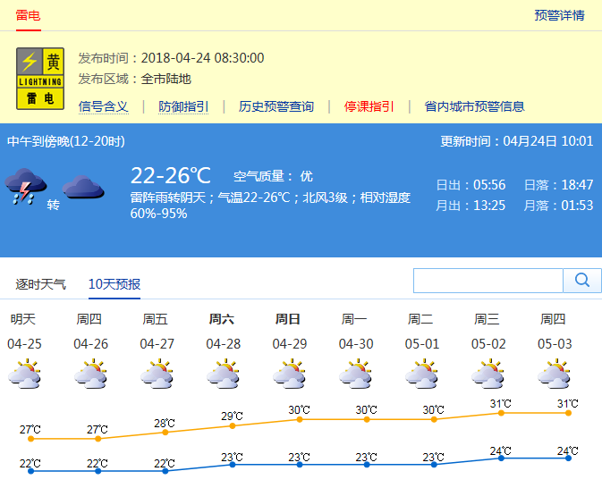 【深圳市雷電預(yù)警】深圳市氣象臺于2018年04月24日08時30分在全市陸地發(fā)布雷電預(yù)警,預(yù)計30分鐘內(nèi)全市將受雷電影響,按照防御預(yù)案停止戶外易燃易爆危險作業(yè),并加強(qiáng)危化場所安全管理。