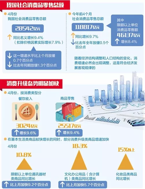 4月份,按消費類型分,餐飲收入3024億元,增長9.6%;商品零售25517億元,增長9.4%。