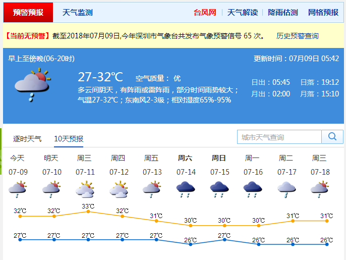 深圳新聞網(wǎng)7月09日訊(記者 何暢)深圳市氣象臺(tái)預(yù)計(jì),9-10日多云有雷陣雨,部分時(shí)間雨勢較大,27-32℃,濕度65%-95%;11-12日天氣酷熱,能見度下降,有灰霾,可能出現(xiàn)局部強(qiáng)對流天氣;13-15日有一次較明顯的降水過程。