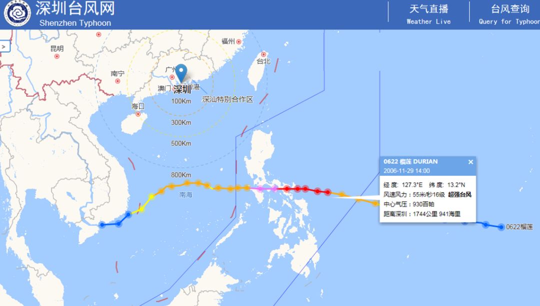 臺(tái)風(fēng)“榴蓮”(泰國(guó)命名)是2006年11月30日在菲律賓登陸的超強(qiáng)臺(tái)風(fēng),雖然對(duì)我國(guó)沒有什么風(fēng)雨影響,但在菲律賓卻造成了上百人死亡、失蹤以及近100萬人直接受災(zāi),并且其二次登陸也給越南造成了上百艘船艇沉沒。