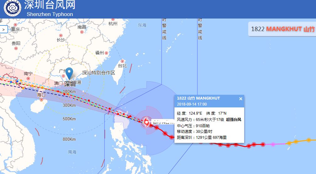 9月14日17時(shí)其位于距我市1291公里的菲律賓以東洋面,中心風(fēng)力17級(jí)以上(65米/秒,相當(dāng)于234公里/小時(shí)),中心最低氣壓910百帕,將以30公里/時(shí)的速度向西北方向移動(dòng)。