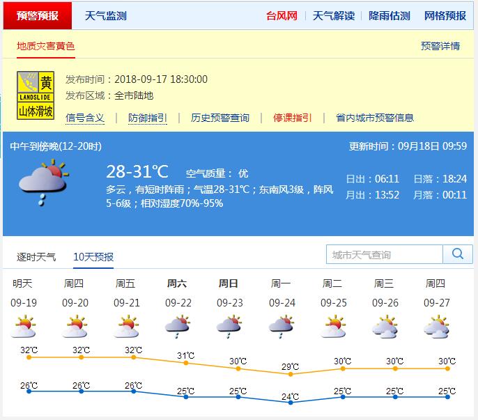 據(jù)深圳市氣象臺消息,19-21日,多云間晴天,中午前后天氣炎熱,局部地區(qū)有短時陣雨;22-24日多云,有短時陣雨。