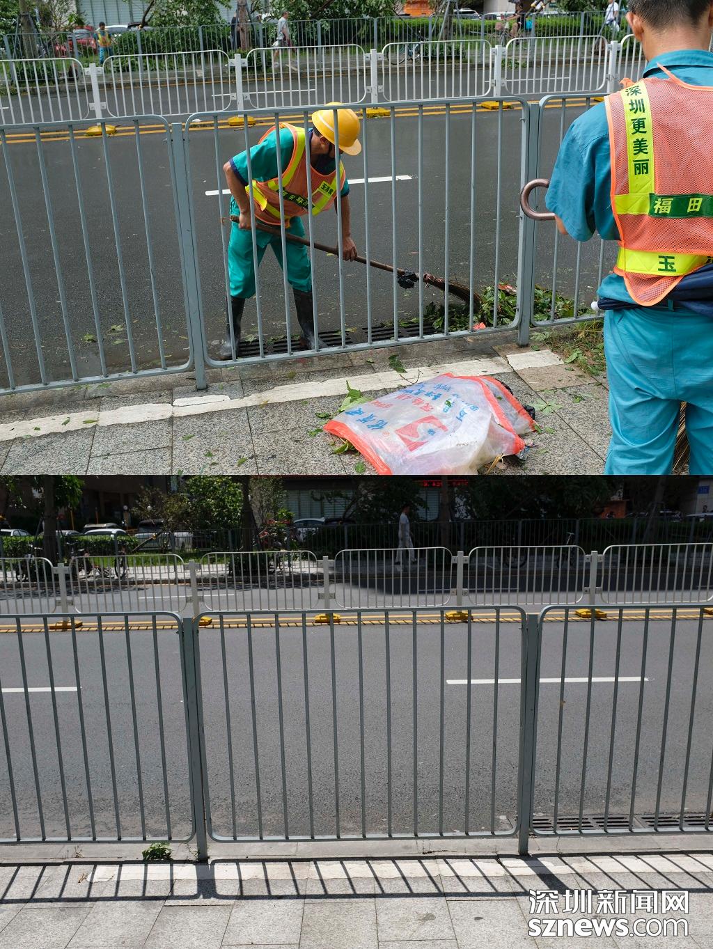 石夏地鐵站E出口清理前后對比(上圖:2018年9月17日,臺風過后,環(huán)衛(wèi)工人正在清掃落葉。下圖2018年9月18日早上,路面已經(jīng)清掃完畢,變得更整潔)