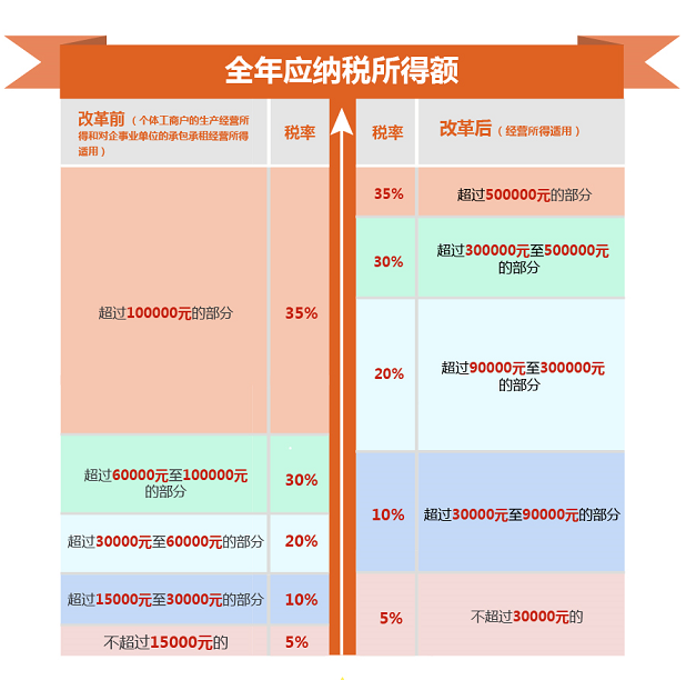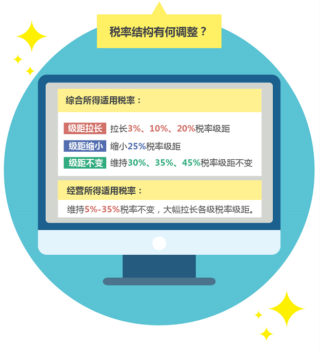 在稅率表的調(diào)整上,此次改革將更多地惠及中低收入群體,對勞動性所得,以現(xiàn)行工薪所得3%-45%七級超額累進稅率為基礎(chǔ),拉大3%、10%、20%三檔低稅率的級距,對經(jīng)營性所得,在維持現(xiàn)行5%-35%五級超額累進稅率的基礎(chǔ)上,也適當(dāng)擴大了各檔次稅率級距,減輕了廣大經(jīng)營業(yè)主的稅負(fù)。