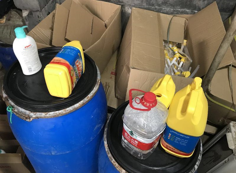 經過執(zhí)法人員檢查,發(fā)現(xiàn)現(xiàn)場有疑似用來制作洗潔精、消毒液等的原料和工具,現(xiàn)場一些箱子中還有未灌裝的空罐子以及一些待貼標簽。據(jù)了解,當事人從外面以低廉價格買來比較劣質、不知名的原料,通過簡單勾兌,再分裝成知名品牌日化用品。