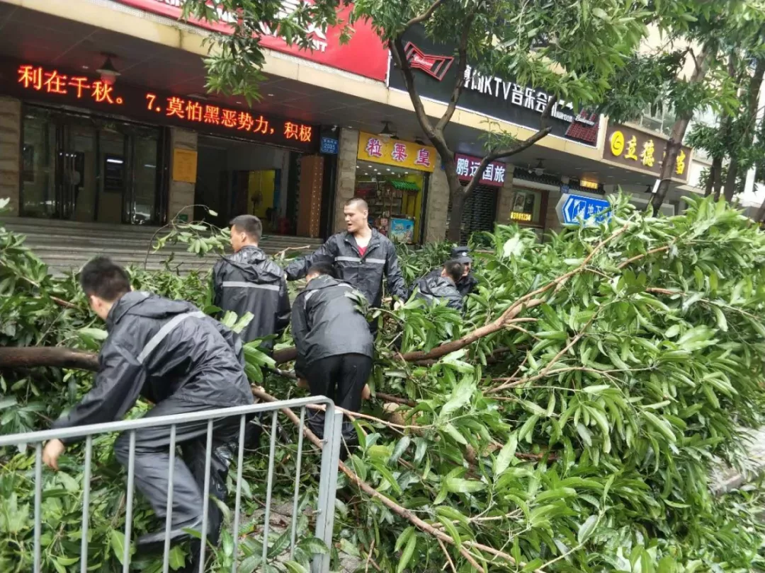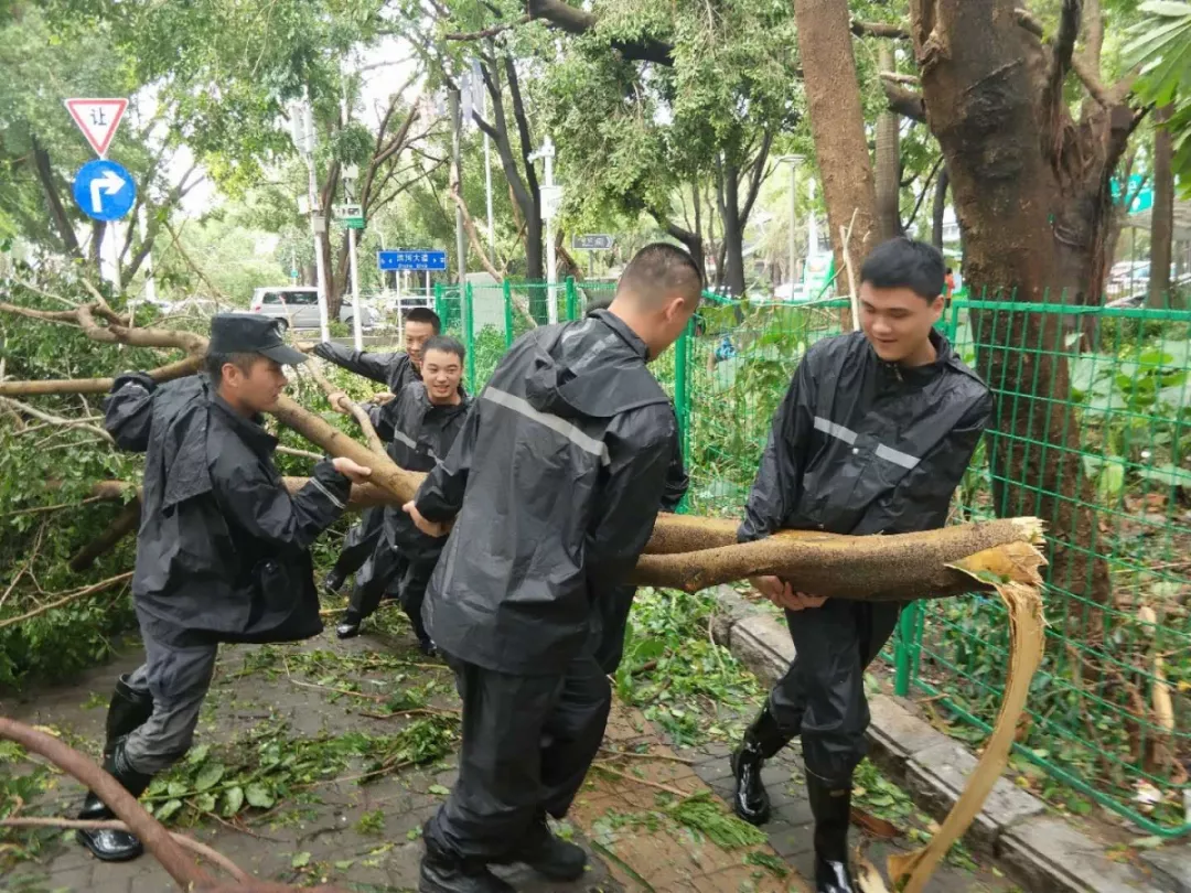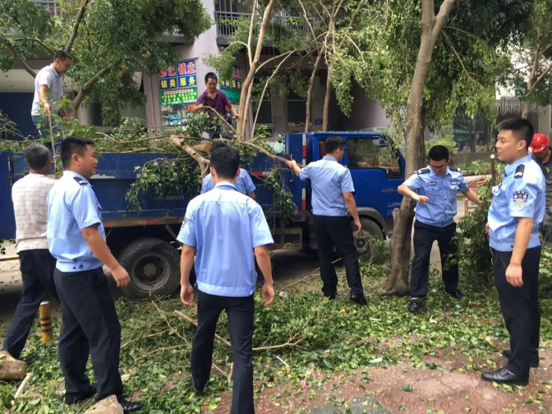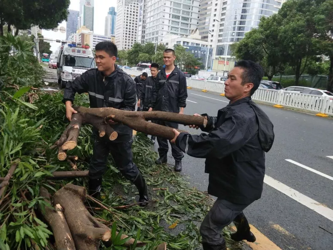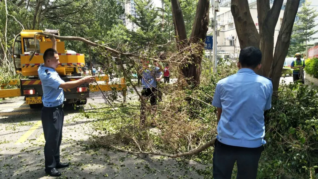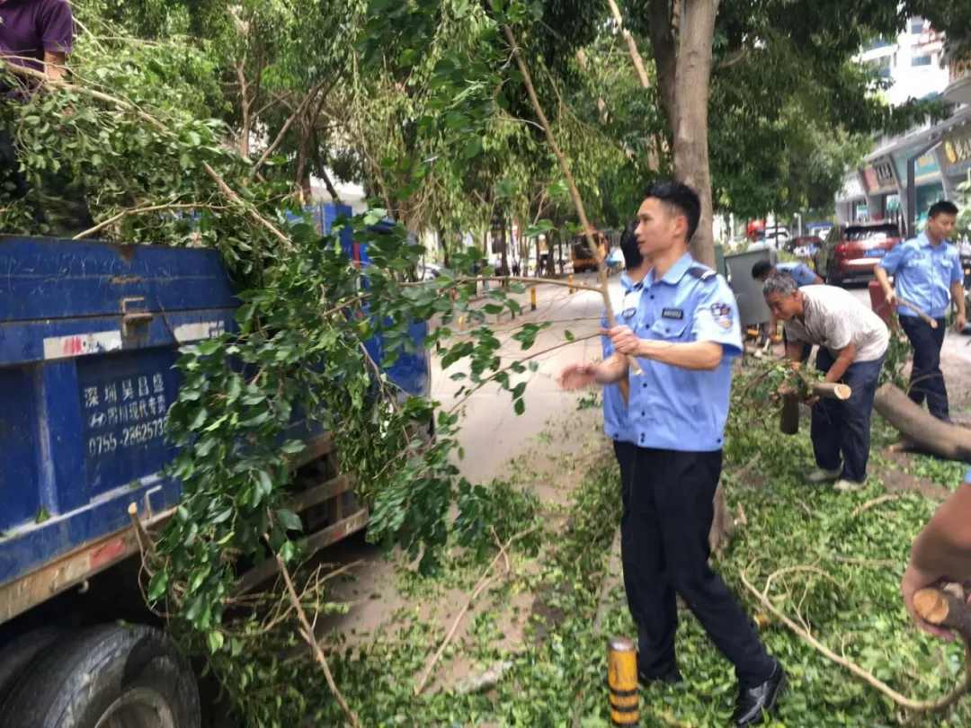9月19日上午,福田區(qū)百花二路、三路,60多名身著藍色制服的警察和紅色馬甲的輔警格外顯眼,他們正在揮汗如雨地進行災(zāi)后路障清理工作。