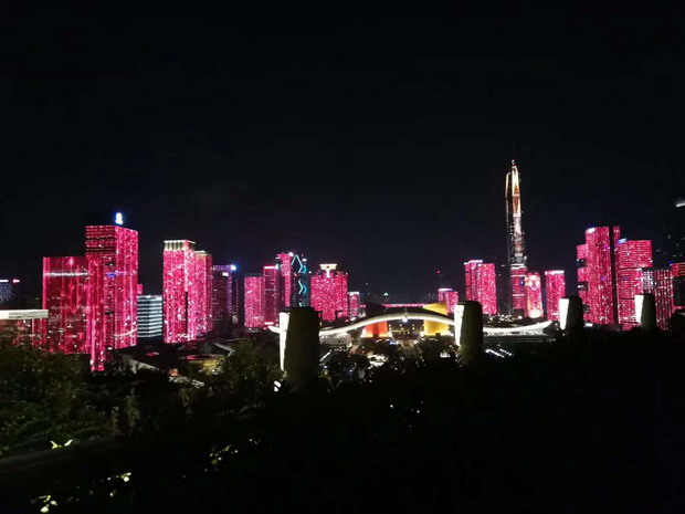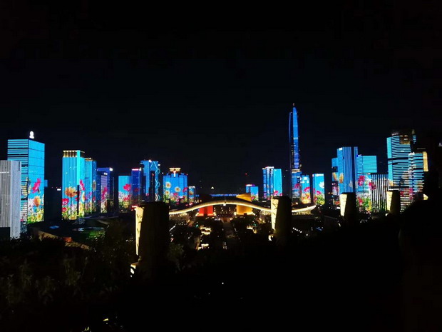 這臺別開生面的晚會,主舞臺設(shè)在市民中心廣場,舞臺后方呈現(xiàn)著深圳市精心打造的福田中心區(qū)43座樓宇燈光秀,五彩斑斕、綺麗多姿的深圳城市新夜景,與晚會現(xiàn)場舞臺融為一體,為市民和廣大觀眾呈現(xiàn)出一個迷人的“深圳之夜”。