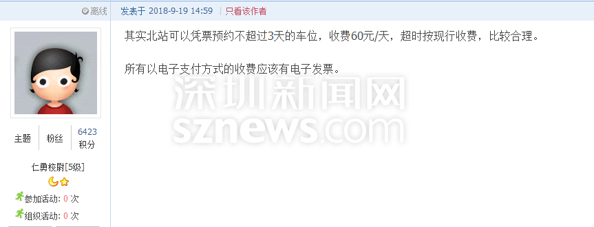 深圳新聞網(wǎng)9月21日訊(記者 施冰冰)“北站停車三天收費412元,這不是暴利嘛?!”近日,深圳一網(wǎng)友發(fā)帖吐槽深圳北站的收費標(biāo)準(zhǔn),他認(rèn)為深圳市中心的商業(yè)寫字樓一天封頂也不過60元,高鐵站社會停車場作為老百姓的公共交通基礎(chǔ)設(shè)施,憑什么比市中心的商業(yè)寫字樓還貴2倍多?(帖文:《 北站社會停車場作為老白姓的公共交通基礎(chǔ)設(shè)施,憑什么比市中心的商業(yè)寫字樓還貴2倍多》)