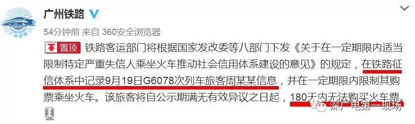 據(jù)@廣州鐵路今天上午10點25分通報稱,鐵路客運部門將根據(jù)國家發(fā)改委等八部門下發(fā)《關于在一定期限內適當限制特定嚴重失信人乘坐火車推動社會信用體系建設的意見》的規(guī)定,在鐵路征信體系中記錄9月19日G6078次列車旅客周某某信息,并在一定期限內限制其購票乘坐火車。
