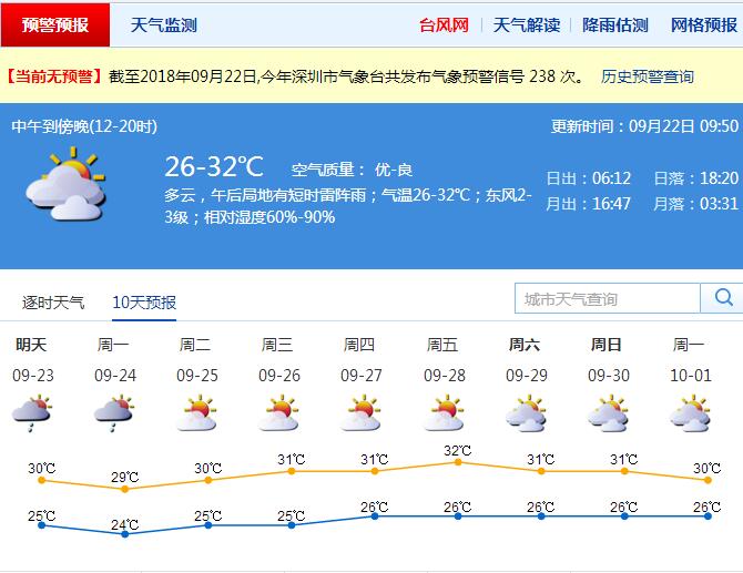 為期三天的假期就要開始了,預(yù)計深圳22日多云,午后局地有雷陣雨,氣溫26~32 ℃。23~24日多云間陰天,有短時(雷)陣雨,其中24日中秋夜多云到陰天,短暫時間可見月亮。