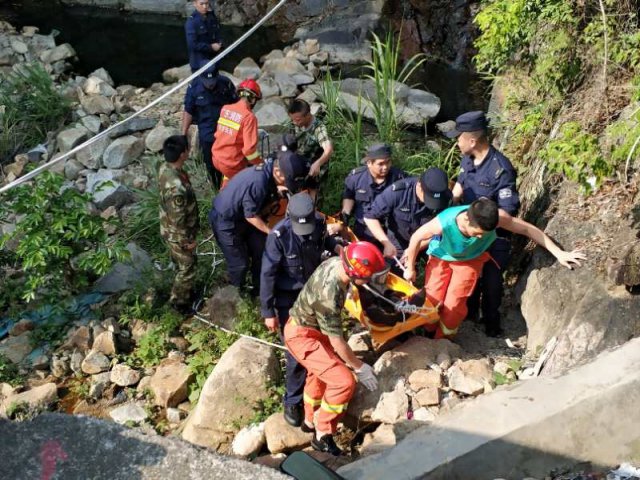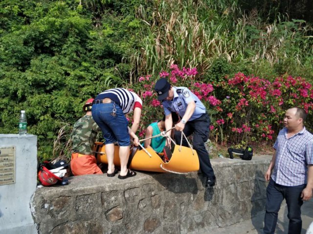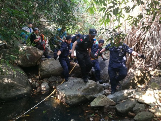 到現(xiàn)場(chǎng)后,民警了解發(fā)現(xiàn)該男子在爬山的過(guò)程中不小心踩到苔蘚摔倒受傷,當(dāng)場(chǎng)倒地不起,無(wú)法動(dòng)彈。情況緊急,四周山路陡峭,120急救人員短時(shí)間內(nèi)難以到達(dá)進(jìn)行救治。這時(shí),葉孟庭等民警當(dāng)機(jī)立斷,將同行救援隊(duì)員分成兩組,用擔(dān)架將傷者一步步接力抬下山。此處位于亂石山澗中,隊(duì)員只能齊心協(xié)力抬著擔(dān)架一點(diǎn)一點(diǎn)小心挪移,坡陡石滑,空氣悶濕,加之荊棘擋道,隊(duì)員們汗如雨下,整整花了2個(gè)多小時(shí)才將擔(dān)架安全抬到盤山公路懸崖邊,隊(duì)員們個(gè)個(gè)衣衫濕透,手腳上的擦劃痕跡清晰可見。