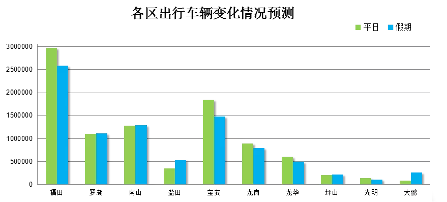 除以上兩個(gè)區(qū)域外,我市其余各區(qū)車輛會(huì)較平日有所下降,而原關(guān)外的福田、寶安、龍崗,出行車輛數(shù)下降較為明顯,整體來(lái)看,全市出行車輛數(shù)將減少6%。