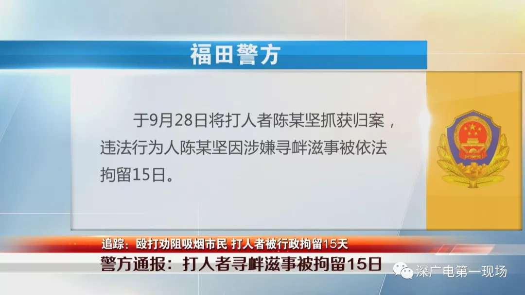 事情發(fā)生之后,福田警方很快介入調(diào)查,于9月28日將打人者陳某堅(jiān)抓獲歸案,違法行為人陳某堅(jiān)因涉嫌尋釁滋事被依法拘留15日。
